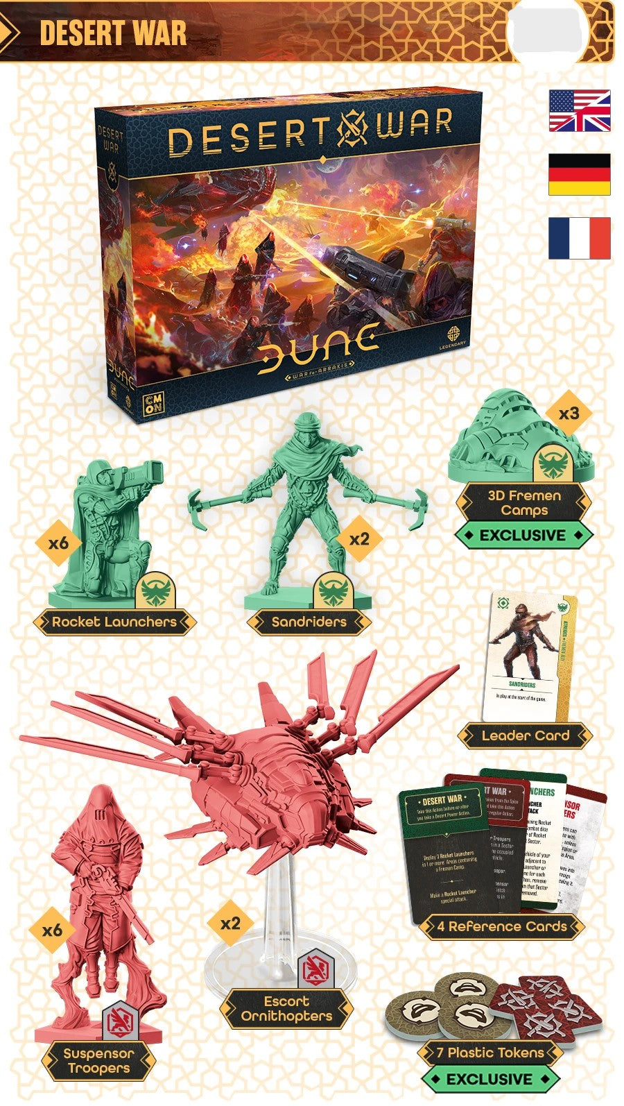 The Desert War expansion brings a variety of brand new units to reinforce both sides of the war on Arrakis. This exclusive version includes EXCLUSIVE Fremen Camp miniatures and Plastic versions of the cardboard tokens.