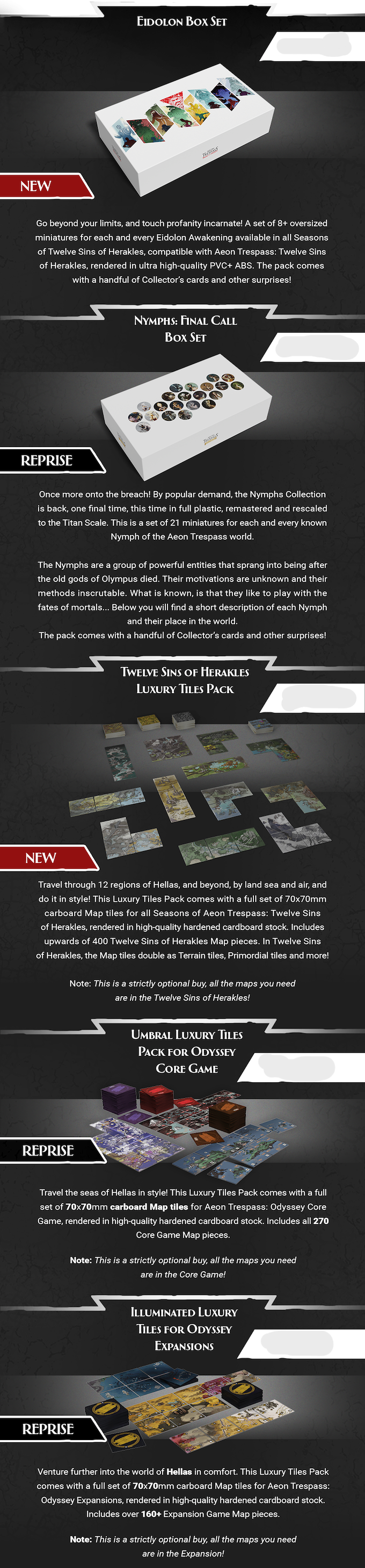We verified that the 💀 Talespinner Titan Expansion, 📔 Last Tome Campaign Binder & Tuckbox, 💎 Eidolon Miniature Box Set, 💎 Odyssey Godforms Miniature Set, 💎 Nymphs Last Call Collectible Box Set, 💠 Illuminated Luxury Tiles Pack for Odyssey Expansions, 💠 Umbral luxury Tiles Pack for Odyssey Core, 💠 Luxury Tiles Pack for Twelve Sins of Herakles (All Seasons), 📔 Umbral Cycles Hardcover Book Collection For Odyssey Core Box, 📔 Illuminated Cycles Hardcover Book Collection For Odyssey Expansions Box, and the 🗺️ Battle Mat - Twelve Sins of Herakles were not included in the all-in during crowdfunding. Since we don't like to use the term 'All-In' lightly around here, we make sure to verify these pledges before offering them to you. No reason to worry though, since we already added these expansions in here for you! Now we verified that you are truly getting ALL-IN!