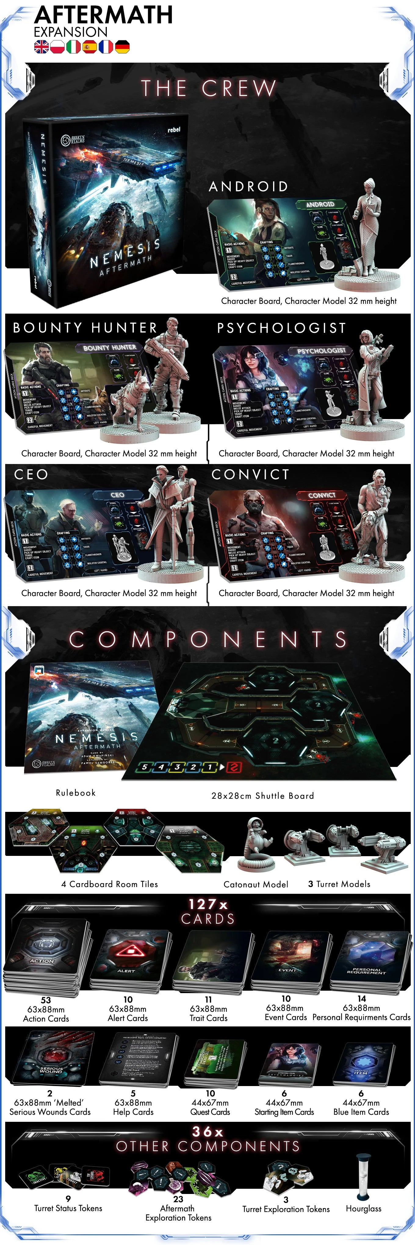 Classic Nemesis Expansion - Aftermath. Also works with Nemesis: Lockdown. Explore Nemesis ship or the Mars base again in search of clues and survival, to once again become the prey of something in the shadows