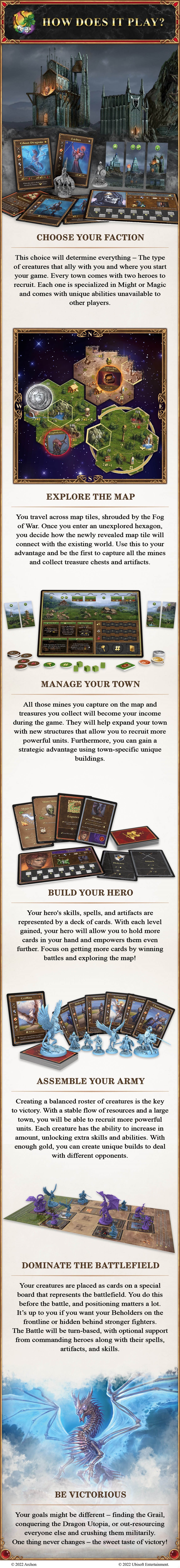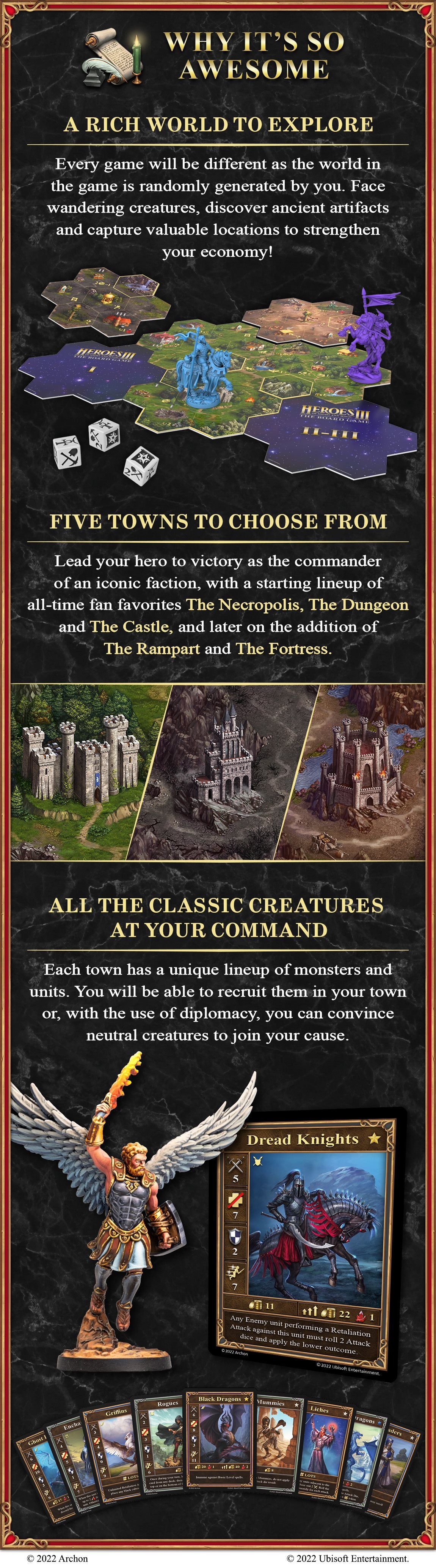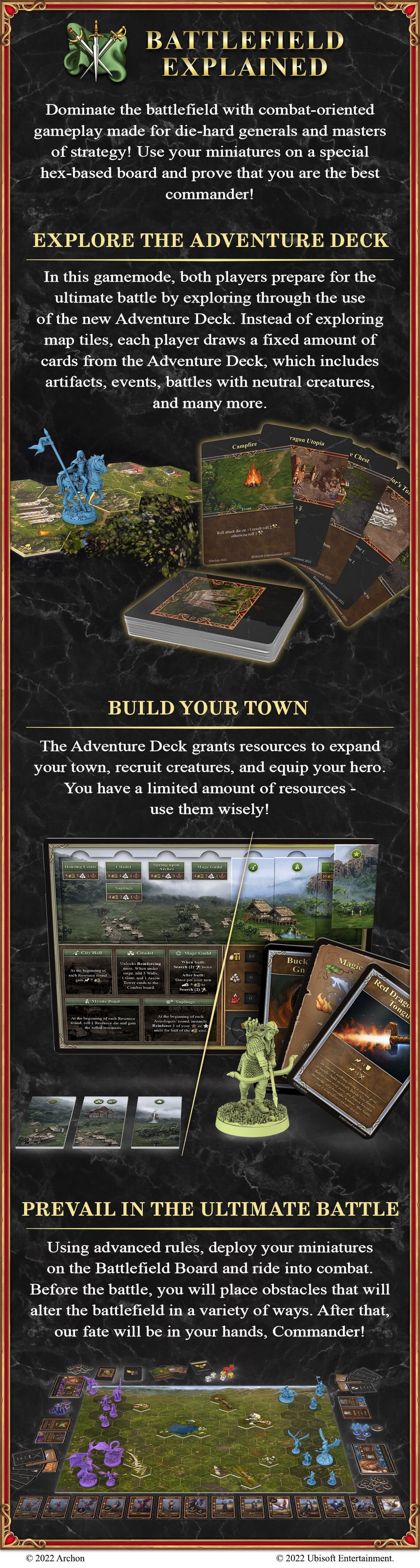Play different scenarios with different victory conditions, explore the adventure map to discover various locations, and play out epic battles using unique cards (or models) that represent the iconic units from the original game. All battles will be performed with cards or models on separate boards.