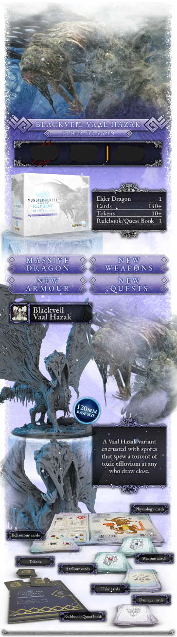 👉 Please note that this item is a PRE-ORDER and the Blackveil Vaal Hazak Elder Dragon Expansion is INCLUDED in the Verified Monstrous All-In! You'll need Monster Hunter World Iceborne: The Board Game Core Box to be able to use this expansion.