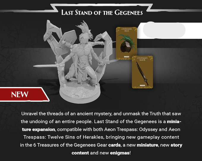 👉 Please note that this item is a PRE-ORDER and the Last Stand of Gegenees Mini Expansion is INCLUDED in the Aeon Trespass Verified Trismegistus All-In Pledge and the Aeon Trespass: Odyssey Verified All-In, and the Aeon Trespass: Twelve Sins of Herakles Verified All-In! You'll need Aeon Trespass: Odyssey Core Box or Aeon Trespass: Twelve Since of Herakles SUMMER to be able to use this expansion.