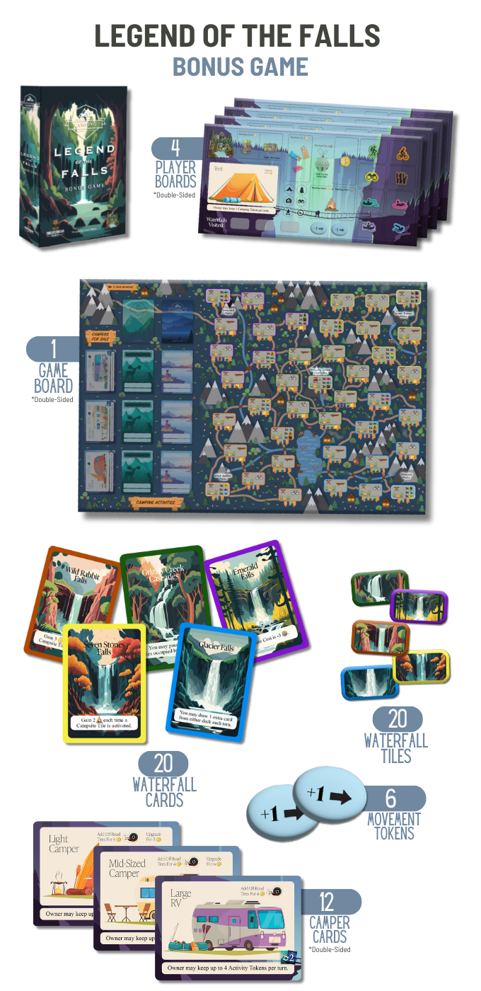 The Kickstarter Exclusive Bear Mountain Camping Adventure Legend of The Falls Expansion by SweaterBear Games Includes: