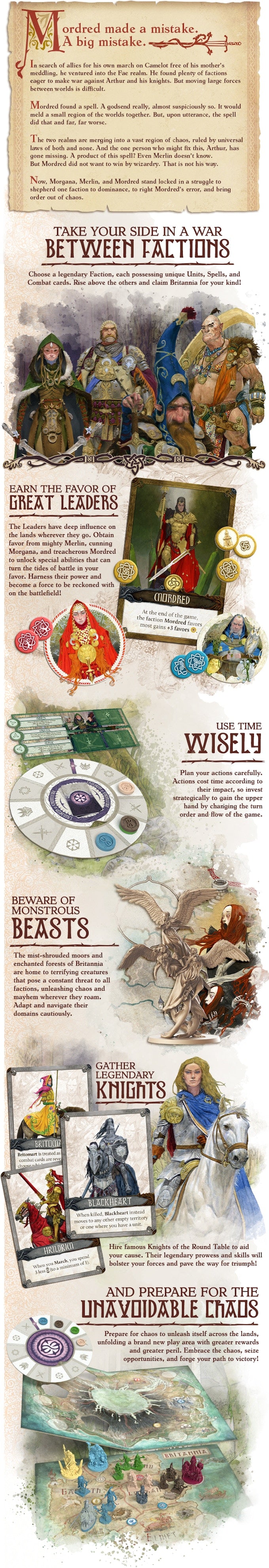 Making use of their unique abilities, factions will attempt to gain the favor of Merlin, Mordred, and Morgana in a war that crosses over realms. They must mitigate the presence and influence of monstrous beasts that roam the land while managing the use of limited resources, including one so fickle as time. Only the rise of a new Kingdom can stop the spreading chaos that creeps across the land.