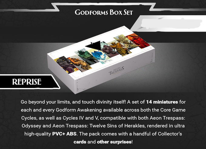 👉 Please note that this item is a PRE-ORDER and the Aeon Trespass: Odyssey Godforms Miniature Set is INCLUDED in the Aeon Trespass Verified Trismegistus All-In Pledge and the Aeon Trespass: Odyssey Verified All-In! You'll need Aeon Trespass: Odyssey Core Box and Expansions Box to be able to use this set.