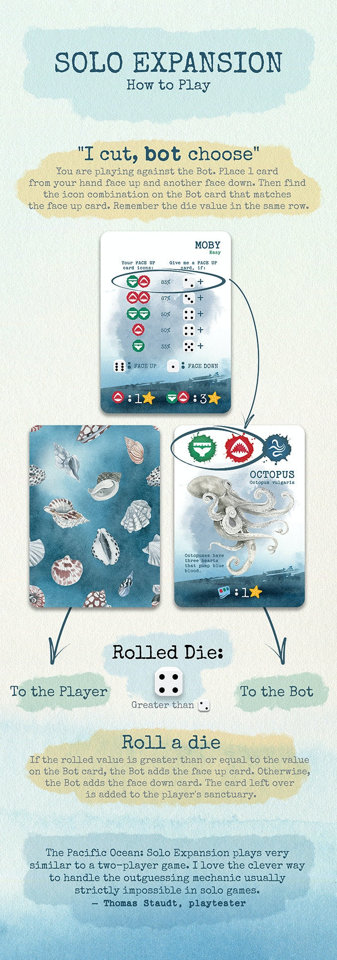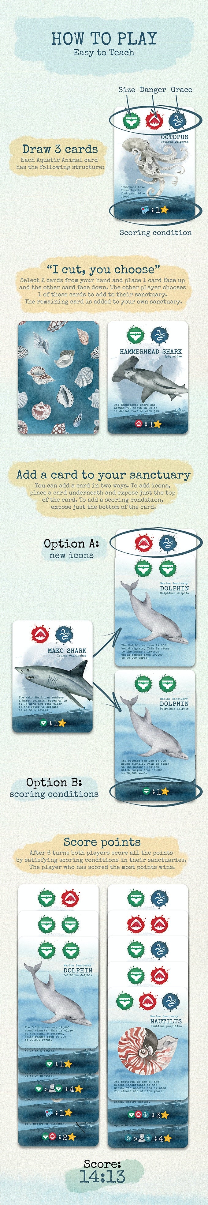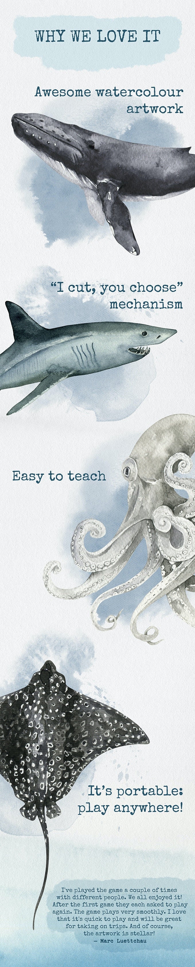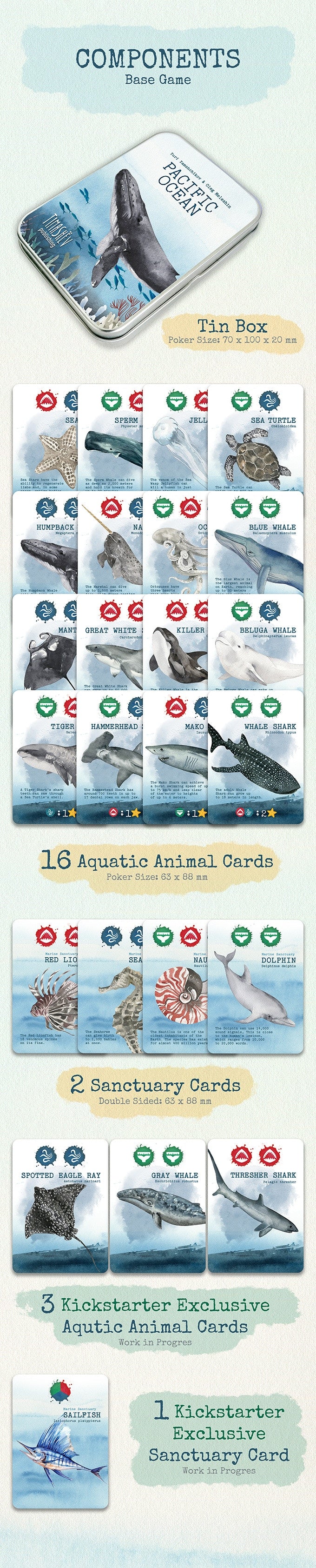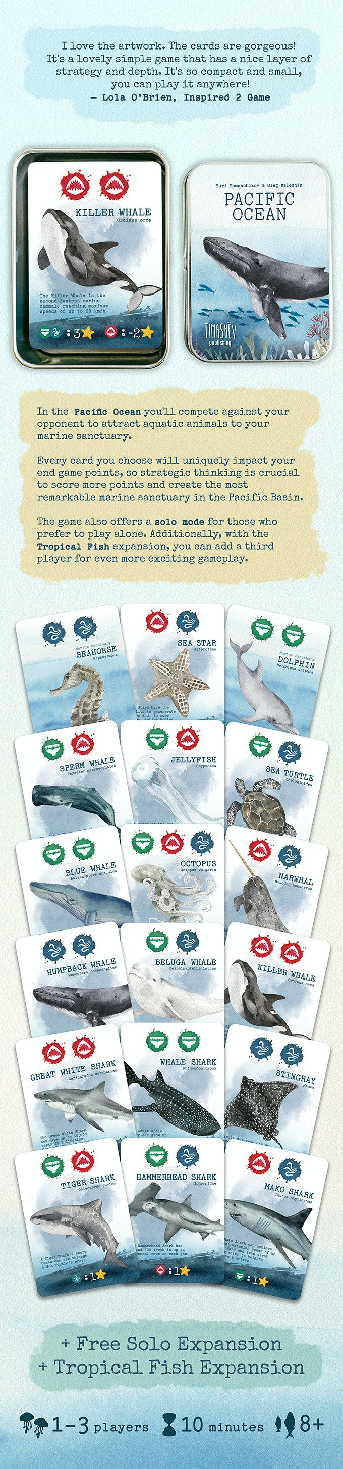 In the Pacific Ocean you'll compete against your opponent to attract aquatic animals to your marine sanctuary. Every card you choose will uniquely impact your end game points, so strategic thinking is crucial to score more points and create the most remarkable marine sanctuary in the Pacific Basin.