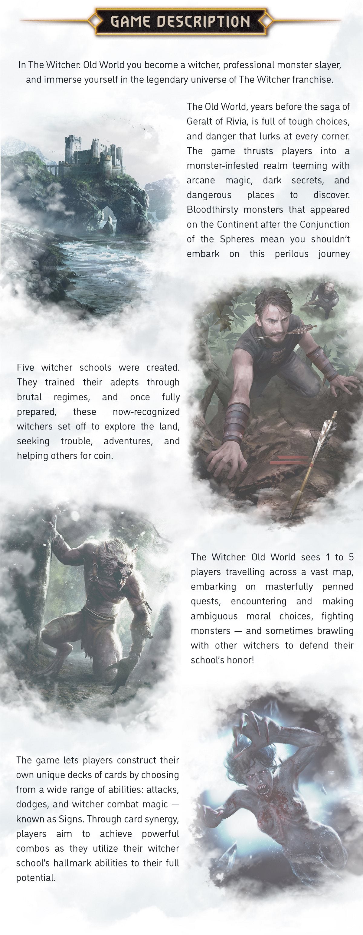 The Witcher: Old World is an action-packed adventure board game, full of immersive choices and excitingly fresh mechanics. Compete to become the best Witcher or cooperate to defeat the monsters of the region.