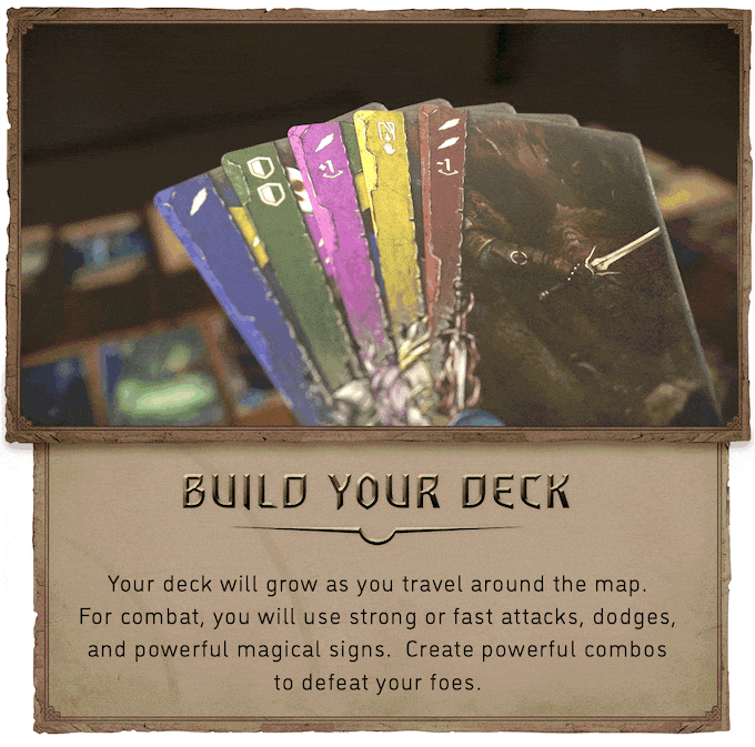 Your deck will grow as you travel around the map. For combat, you will use strong or fast attacks, dodges, and powerful magical signs. Create powerful combos to defeat your foes.