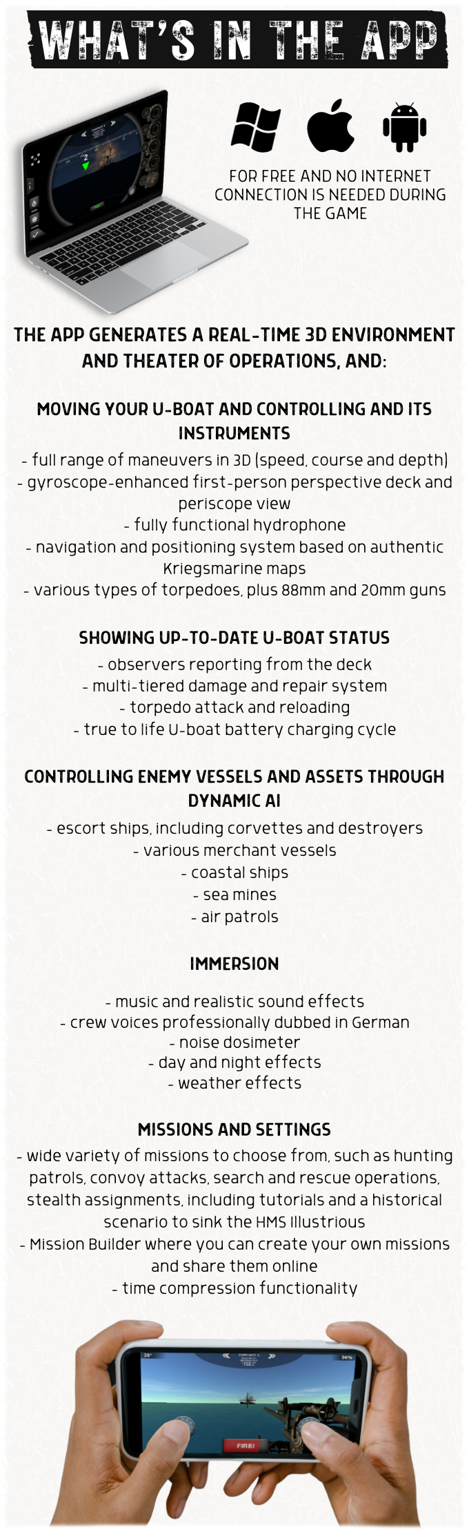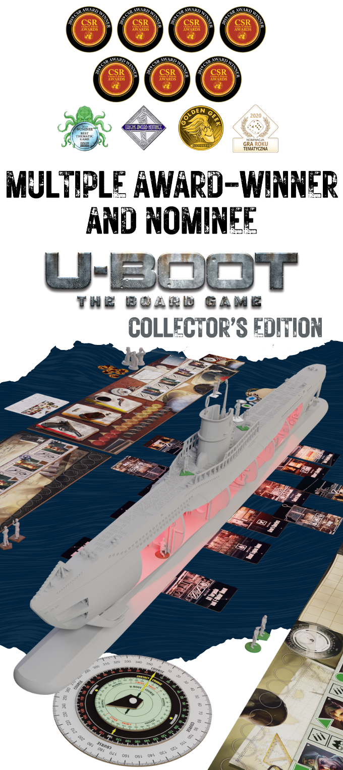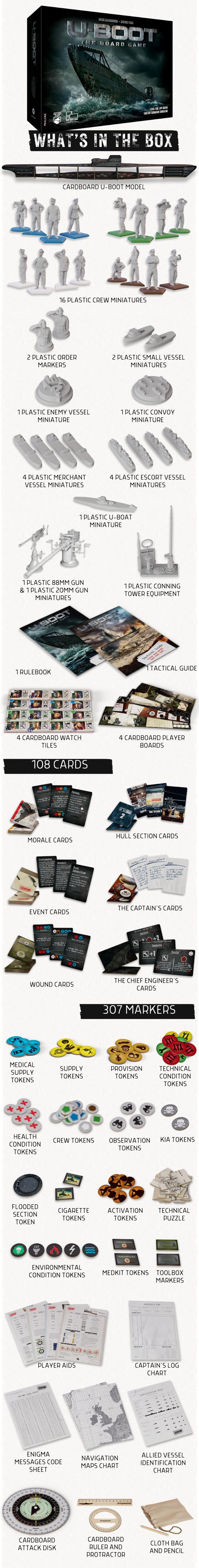 In U-BOOT: The Board Game – Collector’s Edition, 1 to 4 players assume the roles of Captain, First Officer, Navigator, and Chief Engineer on board a VIIC U-boat. They coordinate their actions to fulfill mission objectives, which include patrol duty, ambushing convoys, laying mines in enemy waters, and more. From quick skirmishes, through full combat missions, to an all-out campaign, U-BOOT: The Board Game – Collector’s Edition allows you to conduct submarine operations in major naval theatres of World War Two.