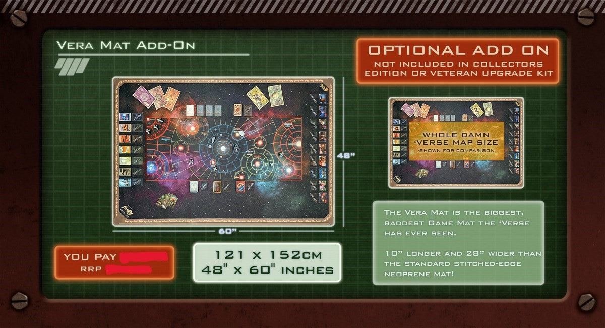 The Vera Mat is the biggest, baddest Game Mat the ‘Verse has ever seen. Measuring 48” x 60”, there is enough space for up to six players, marked spaces for up all the Contact and Supply decks - including the new Capers decks, plus lots of shiny details!